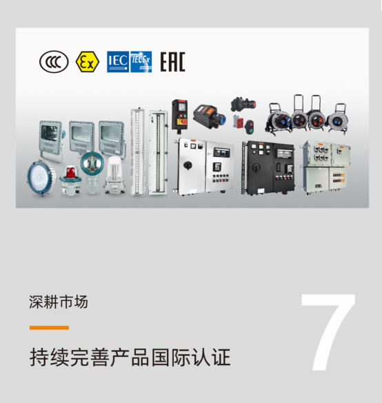 2021年,公司持续推进产品国际化进程,CZ0878/CZ6478系列防爆泛光灯和CE/CKX系列防爆电器箱等完成IECEx/ATEX国际防爆认证工作。目前,创正电气95%以上的产品都实现了同一款产品三个认证(中国CCC、欧盟ATEX、国际电工委IECEx)的目标。