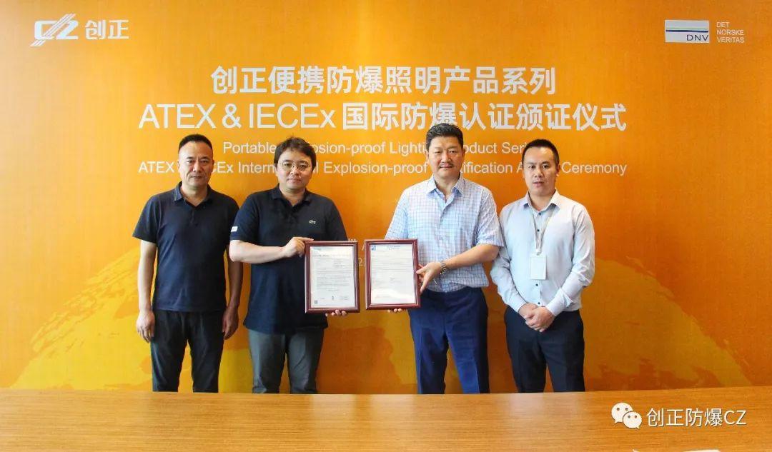 作为对创正在防爆领域辛勤努力的认可,DNV负责人向创正颁发了九款便携防爆照明产品的ATEX(欧盟防爆认证)和IECEx(国际防爆认证)产品认证证书,以及防爆管理体系证书,向创正所取得的成就给予了高度的认可。这些证书的颁发进一步巩固了双方在防爆市场领域中的领先地位,彰显了创正在防爆领域的技术实力和卓越表现。