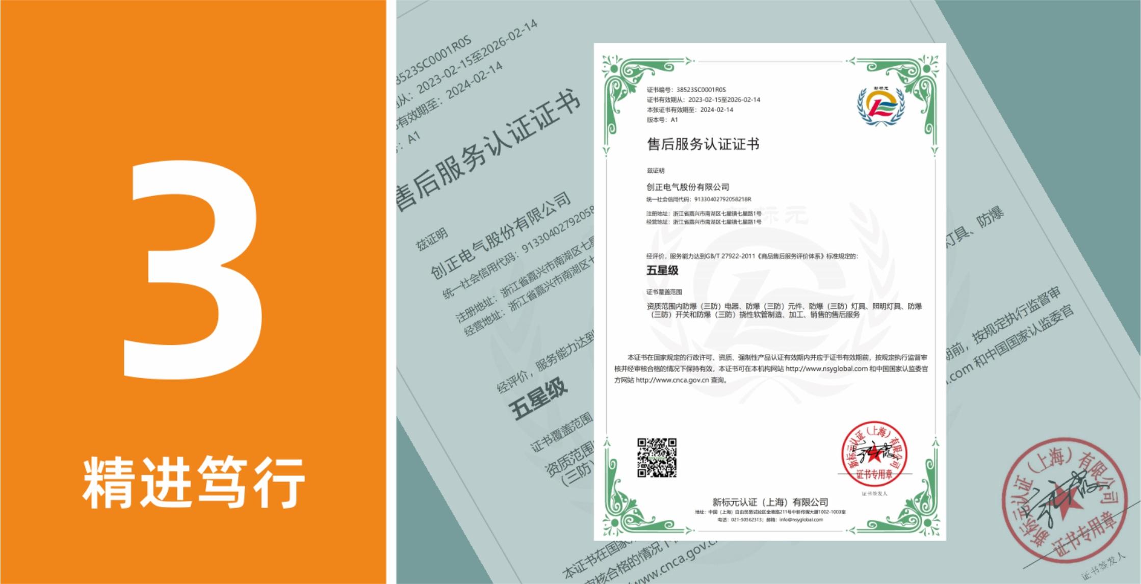 2023年公司取得售后服务认证证书,荣获“售后服务五星认证”。五星售后服务认证是指对企业的售后服务质量进行全面考核,并对企业在客户服务、个性化服务、技术支持、服务保障、速度效率等五方面按照特定标准给予星级认证的过程。